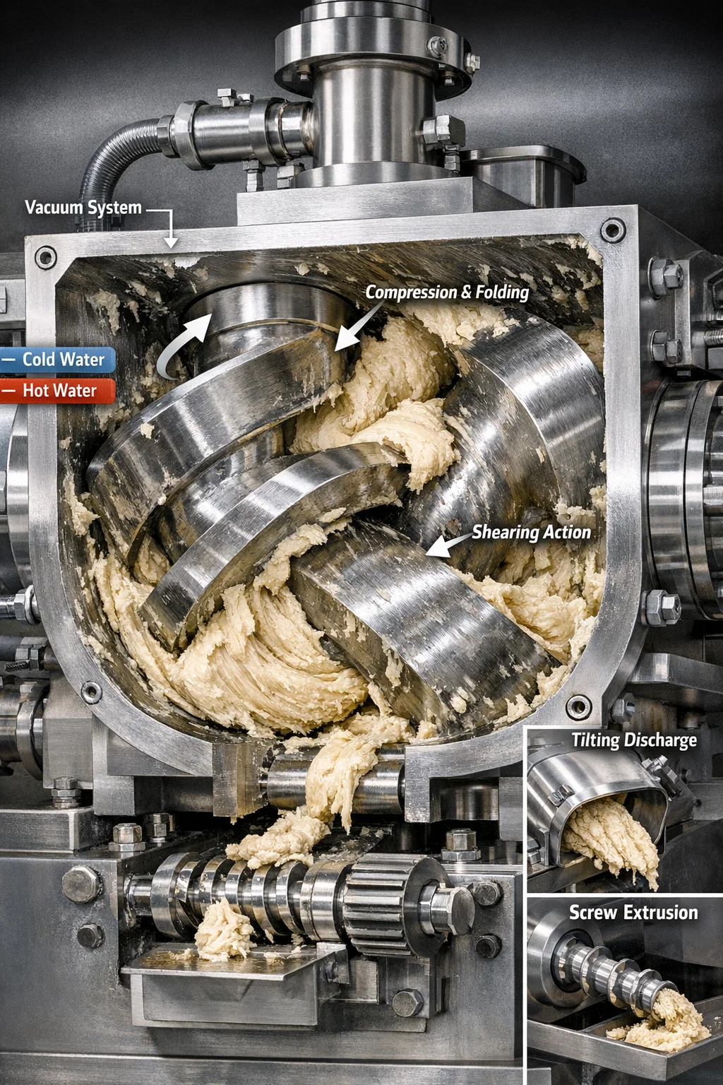 Temperaturkontroll: Maskinens "buk" (kammeret) er vanligvis dobbeltvegget, slik at varmt eller kaldt vann kan sirkulere mellom lagene. Dette gir mulighet for oppvarming (for å myke materialet for lettere elting) eller avkjøling (for å forhindre overoppheting og ødeleggelse) etter behov.