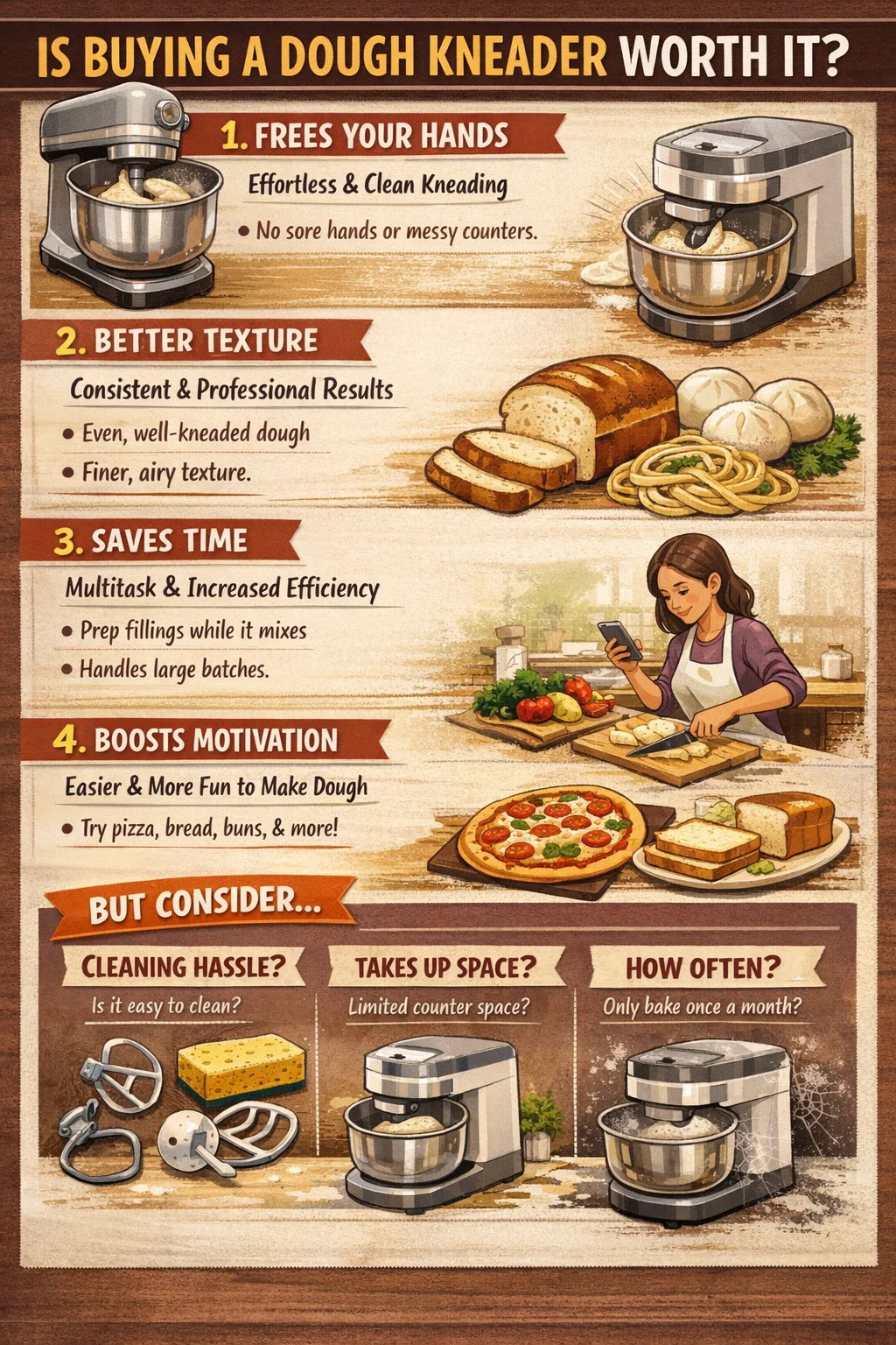 Fin konsistens: Enten du lager mykt brød eller seige nudler og dampede boller, er deigen som eltes av en maskin vanligvis finere og har jevnere luftlommer enn håndelt deig, noe som resulterer i et bedre ferdig produkt.