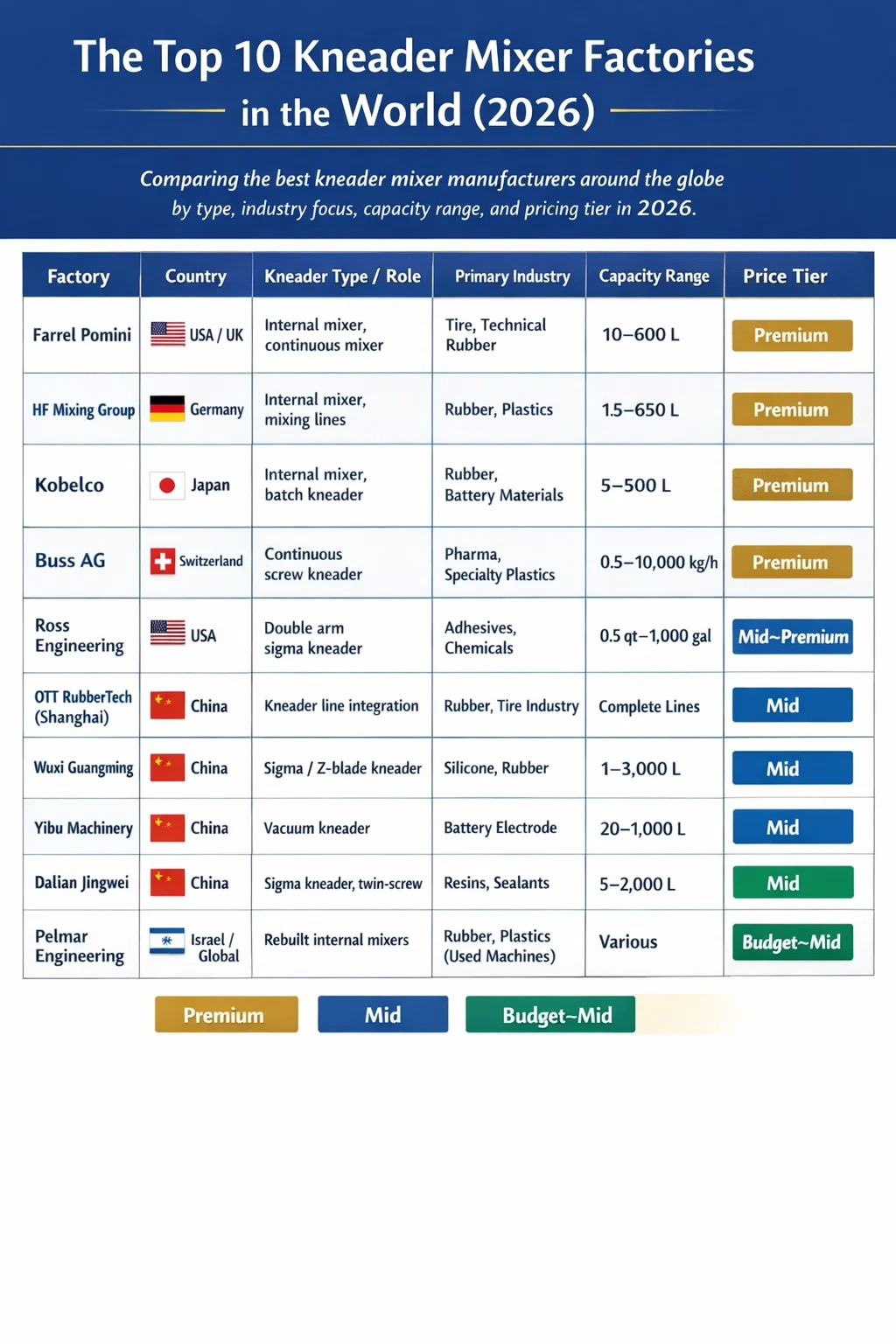 Hvis du kjøper en elter mikser for gummi, silikon, lim, batterimaterialer eller en hvilken som helst høyviskositetsblanding, vil produsenten du velger direkte bestemme utstyrets levetid, blandekvalitet og totale eierkostnader. Etter å ha evaluert produksjonsskala, tekniske sertifiseringer, global installasjonsbase og tilbakemeldinger fra kunder fra dusinvis av leverandører, de ti fabrikkene som konsekvent leder verden innen produksjon og levering av eltemikser i 2026 er: Farrel Pomini (USA/UK), HF Blandegruppe (Tyskland), Kobelco (Japan), Buss AG (Sveits), Ross Engineering (USA), OTT RubberTech International Trading (Shanghai) Co., Ltd. (Kina), Wuxi (Kina, Guang), Machinery (Kina, Guang), Chemical Machinery (Kina) og Pelmar Engineering (Israel). Hver av dem har en distinkt styrke - enten det er ultrahøyt dreiemomentkapasitet, sanitærdesign av farmasøytisk kvalitet, full gummieltelinjeintegrasjon eller kostnadskonkurransedyktige priser for produksjon i mellomvolum.
