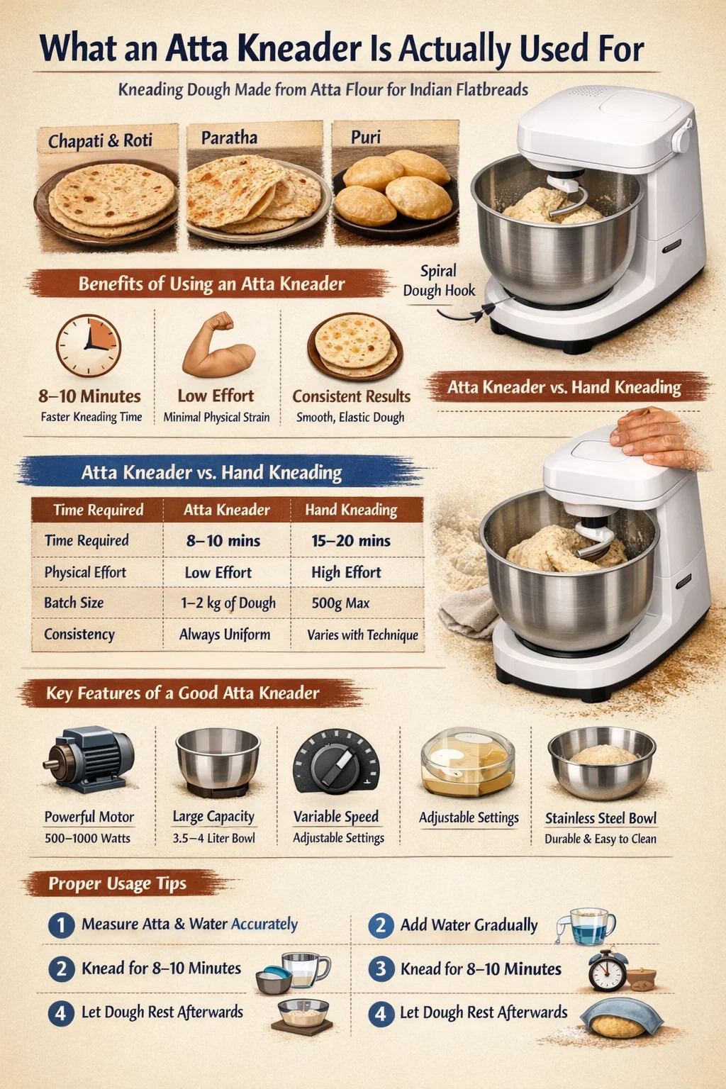 Det kritiske punktet er at atta - som er et fullkornshvetemel med høyere fiberinnhold enn raffinert mel - er tettere og mer motstandsdyktig mot hydrering. En elter bygget for atta er kalibrert for å håndtere denne tettheten uten å overopphete motoren eller belaste mekanismen.
